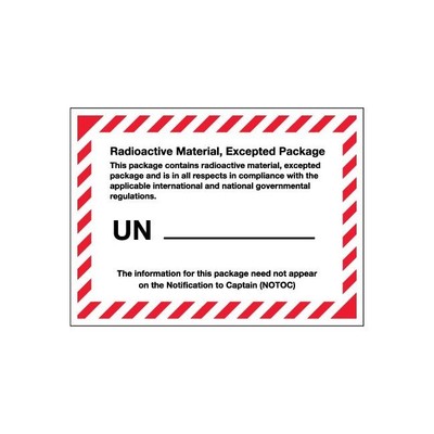 Radioactive Material, Excepted Package Labels Specify the UN Number when shipping radioactive materials with Labelmaster's Radioactive Material Excepted Package Labels. Printed on paper, these allow you to fill in your UN Number using your PC and printer or have us personalize it for you. Whether you choose personalized labels ... Access This Document